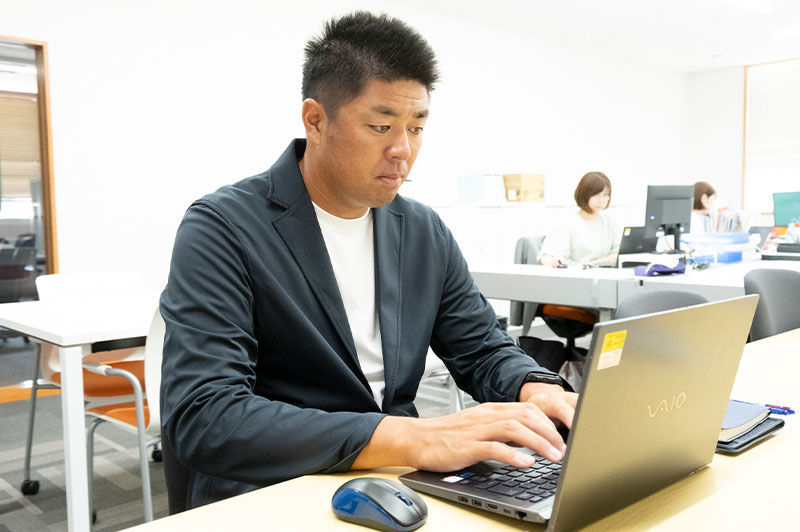 元プロ野球選手として2008年から2015年まで広島東洋カープで活躍。現役引退後は、「野球を続けながら仕事も両立できる環境」を求めて就職活動を行い、福山市内の企業12社が支援する社会人野球チーム“福山ローズファイターズ”に入団。当初は純粋に野球を続けたい気持ちからの決断でしたが、仕事と野球を両立させる企業の姿勢に共感し、エブリイへの入社を決意。青果部門に配属となり仕事とスポーツの両立を行っていた。現在は新人財開発戦略部に所属し、自らの野球経験を活かして地域の高校を中心に訪問。野球を通じて地域の若者の未来を支える活動に力を注いでいる。さらに、福山ローズファイターズの下部組織である中学硬式野球チーム“福山ローズファイターズヤング”のコーチも務め、地域のスポーツ振興と次世代選手の育成に積極的に取り組んでいる。
