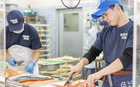 作る人、運ぶ人、売る人、買う人、料理する人、“食”をつなぐ全ての人に感謝の想いを持ち、関わる方々に喜んでもらえる商売を追求することで、“食”を通じて人々の幸せや地域の発展に貢献してきました。